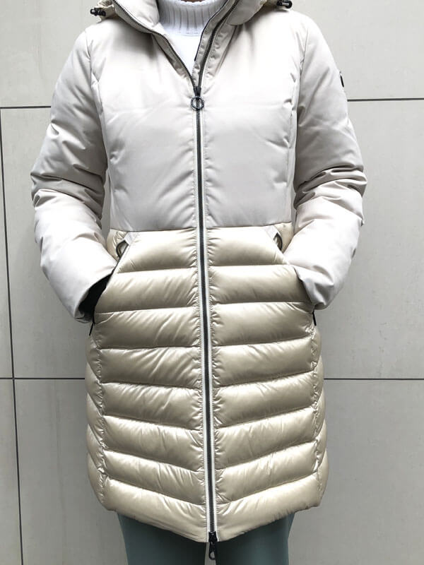 ウエストから下がダウンパック有り、上がダウンパック無しで綺麗めな雰囲気で、すっきりとした形です。 防水ナイロンでホワイトでも汚れが気になりにくいのも◎。 色違いはブラックがございます。