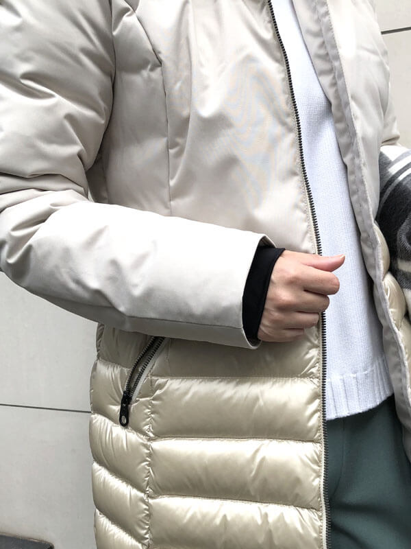 こちらのモデルは超軽量ナイロンでテフロン加工を施しているので、軽くて水や汚れにも強いダウンです。上品な光沢感もポイント。