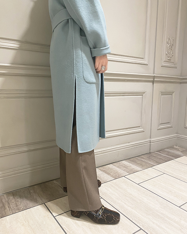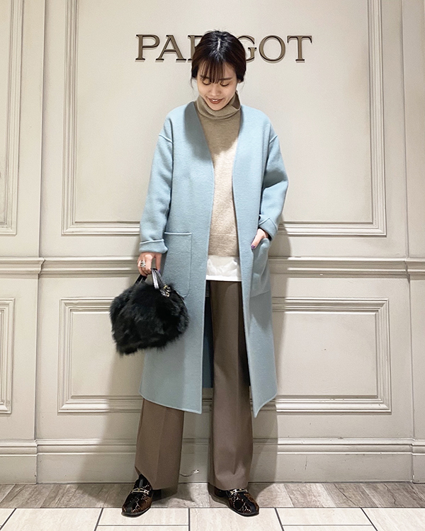 ノーカラーなので着膨れ感無く、タートルニットやストールも楽しめること間違いなし。