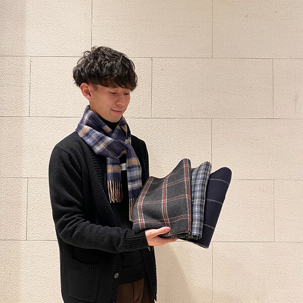 冬のアイテムはついつい暗く、無地なアイテムが増えてしまいますので、マフラーで柄を取り入れてもらいましょう!