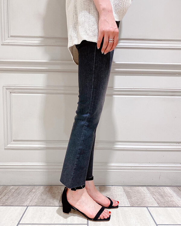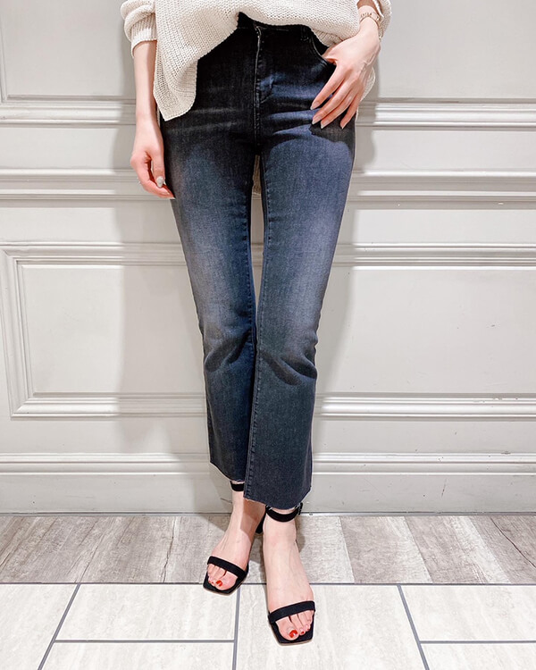 クロップド丈のフレアシルエットで、脚長効果抜群で、足首を華奢に見せてくれるデニムです。