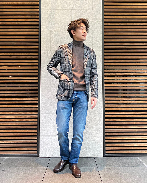 細身でフィットする作りですが、ストレッチ性のある生地なので、ストレスフリーでお召いただけますよ!!