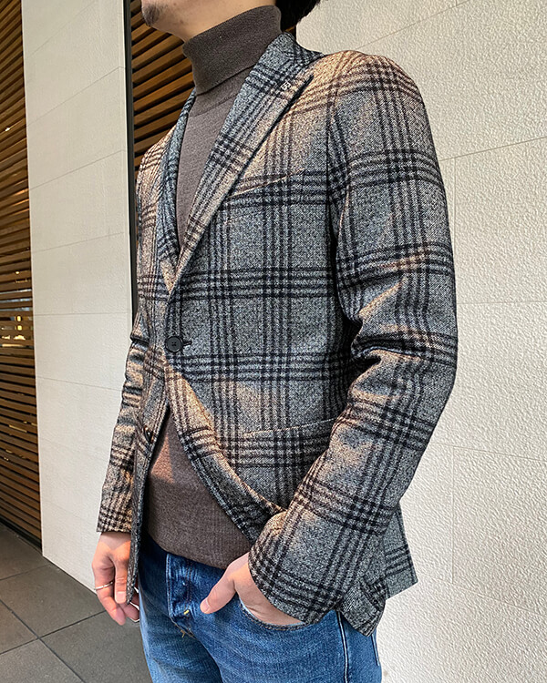 着た時にシャープにスタイルアップして見えるよう計算されて作られているこちらのジャケット。
