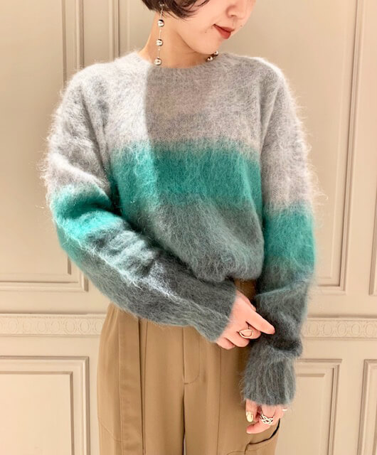 グラデーションがキレイなニットは、グリーン〜グレーのカラーリングを生かし、寒色のベージュと合わせてスタイリッシュに。