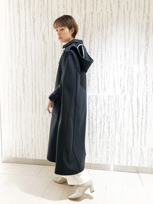 ダッフルコートのディティールに、ホワイトのボタンがポイントになりモードな印象に仕上がります。