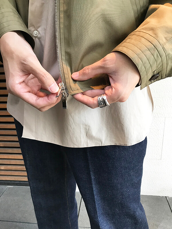 ジップは鏡面仕上げの持ち手で、クラシカルな雰囲気のジャケットとのギャップが◎