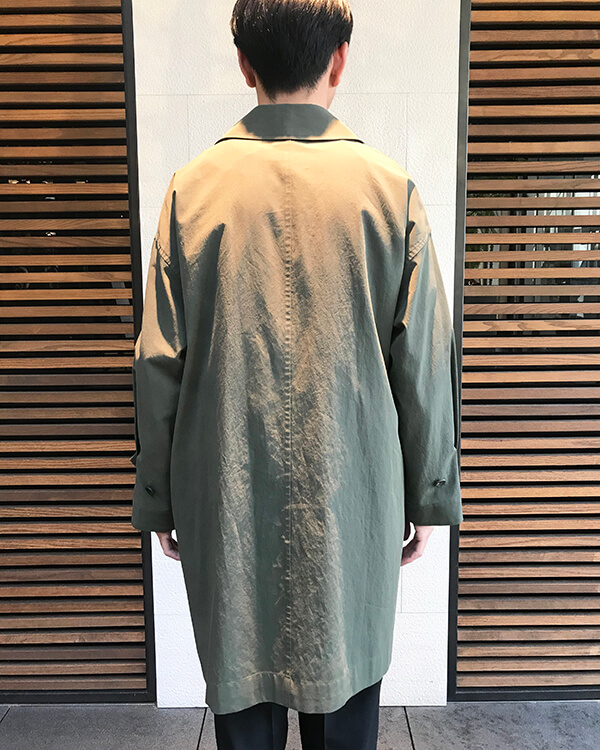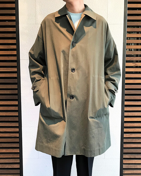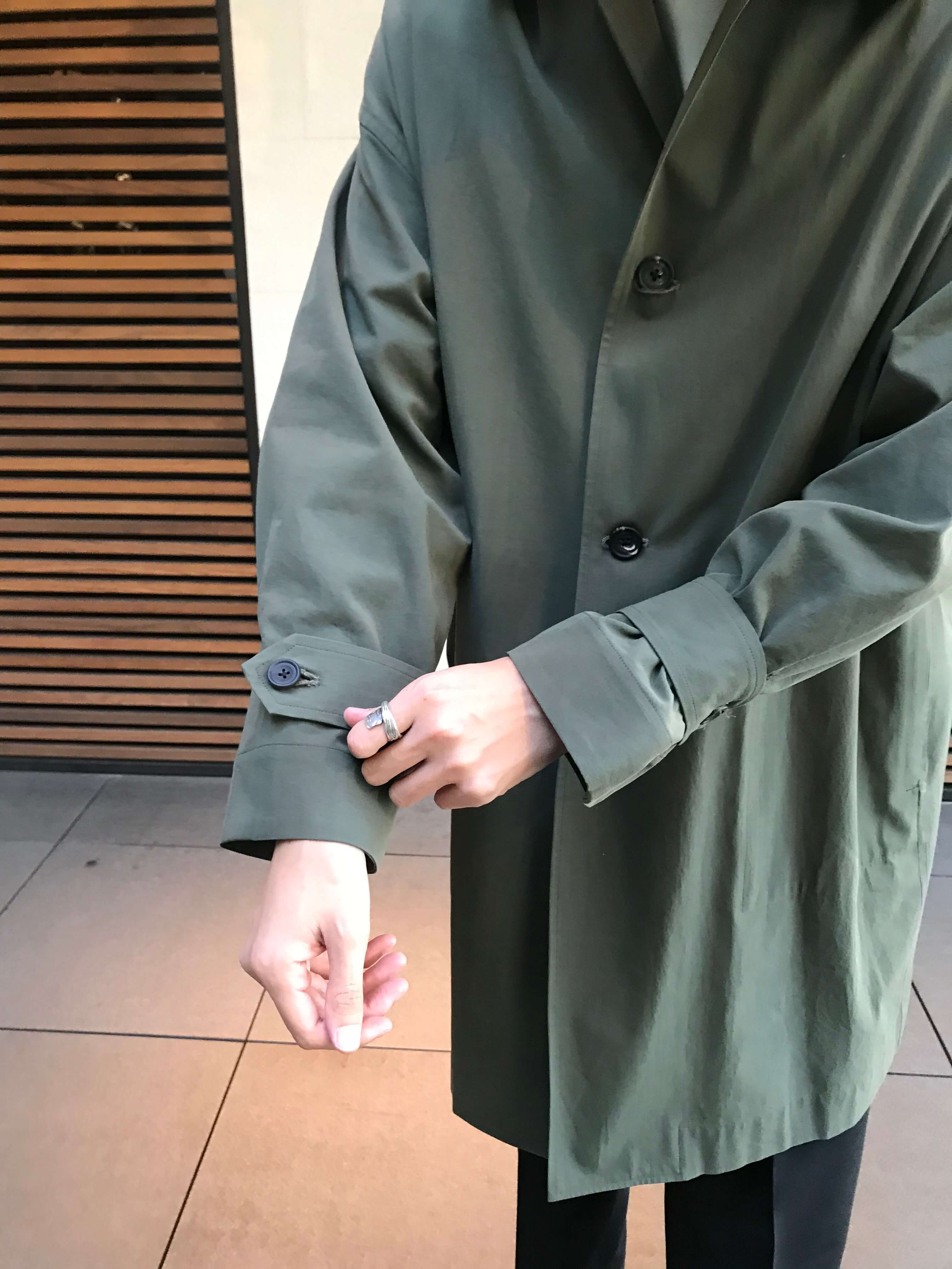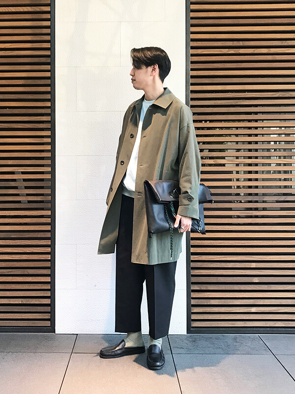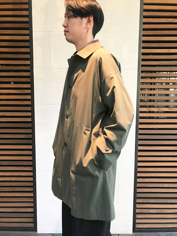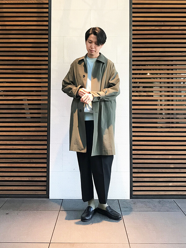 オリーブカラーのコートはルーズ感のシルエットですが、軽やかな生地なので印象も重くならずに仕上がります。