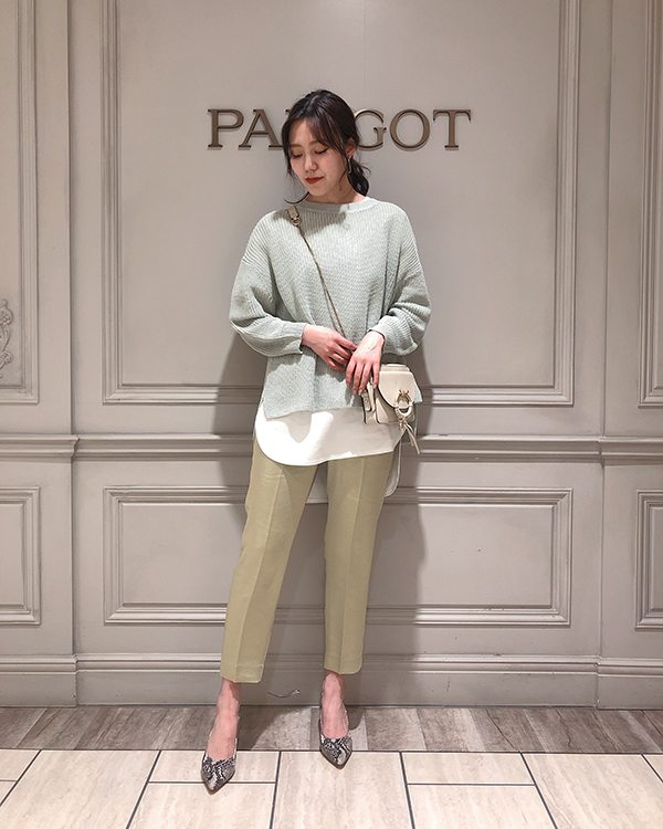 素材感を変えたり、ニットからカットソーを少し見せることによって、のっぺりしがちなワントーンコーデもばっちり決まります✴︎
