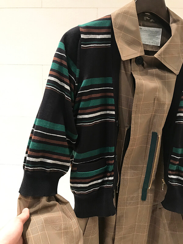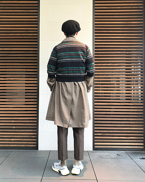 カーディガンのボーダーとコートのチェックが違和感なく馴染むのは流石のデザイン性です。