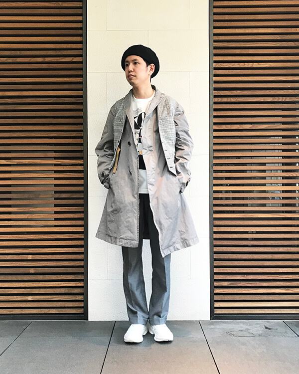 クラシックな雰囲気のあるコートにあえてPOPなロゴのカットソーと合わせてギャップを演出しています。