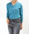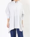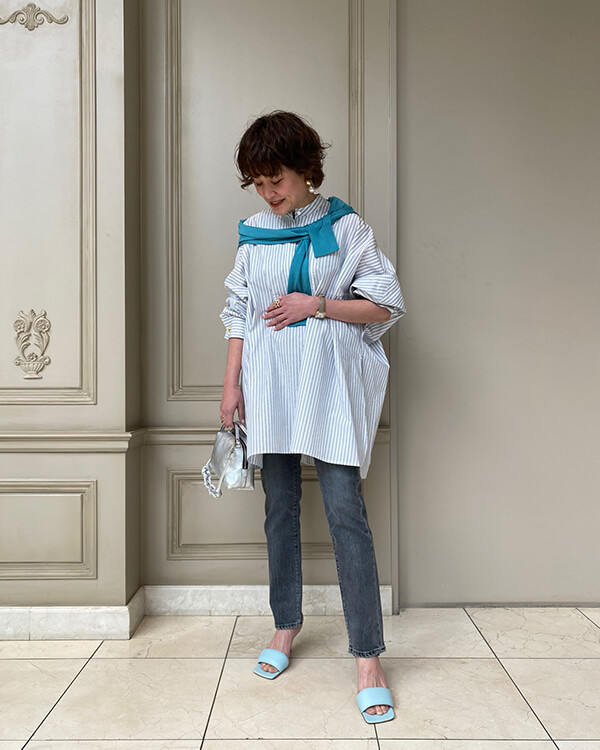 トップスは張りのあるオーバーサイズのシャツは肩回り、身体の厚みをカバーしてくれます。そして差し色にブルーグリーンのカーディガンで顔回りに華やかさをプラスしました。