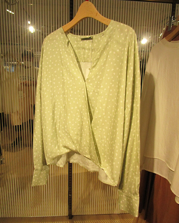 ランダムドットのブラウスはライムグリーンでこなれた印象に。