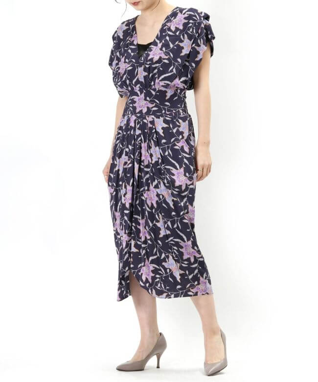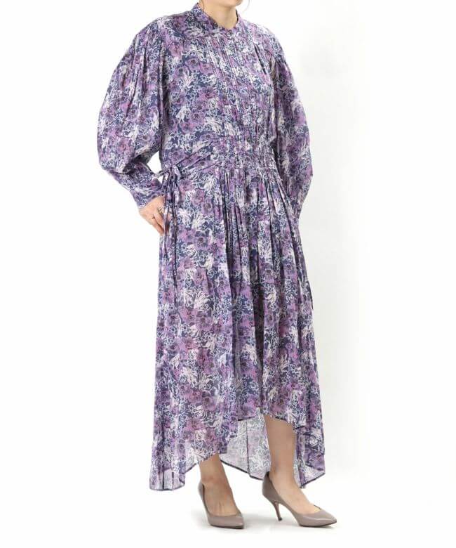 裾がアシンメトリーで軽やかな印象のワンピースもアネモネプリントで大人っぽく。