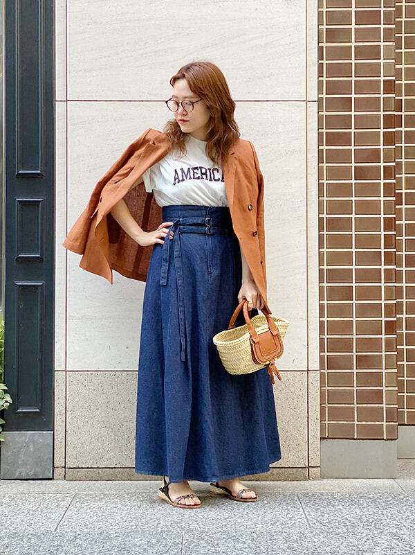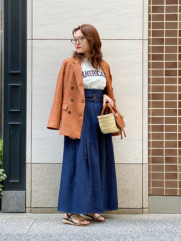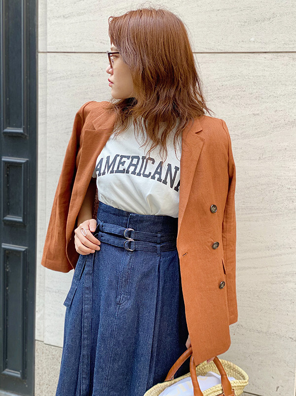 オータムさんといえば、イエローベースのこっくりした色味と相性抜群!きれいめカジュアルが得意ジャンルの方も多いはず!今回はオレンジブラウンのジャケットをプラスしてみました。