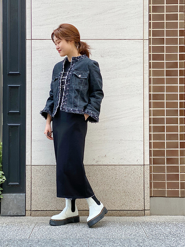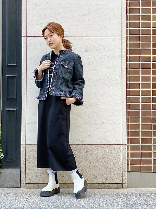 フェミニンすぎるスタイリングが苦手な私は、シンプルなカットワンピと合わせてみました!デニムジャケットなら、かっちりしすぎないのも嬉しいポイント。