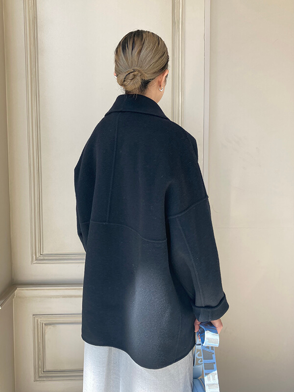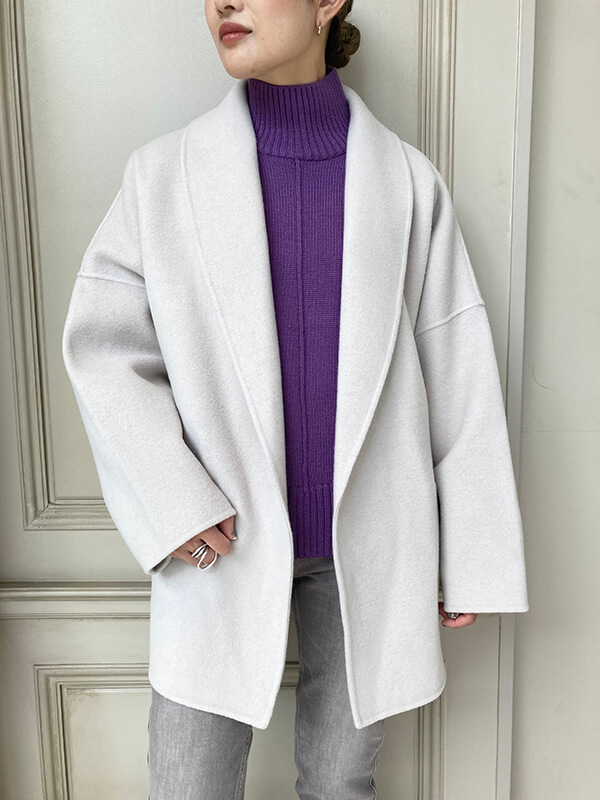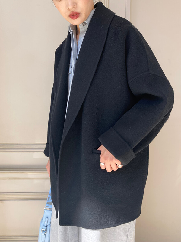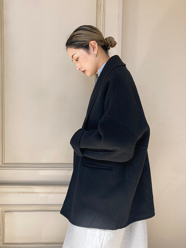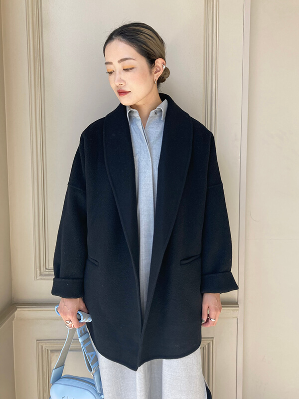 愛されポイントは何といっても丸みのあるショールカラー♡顔まわりに女性らしさと柔らかさを演出してくれるショートコートです。