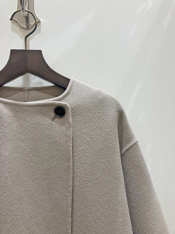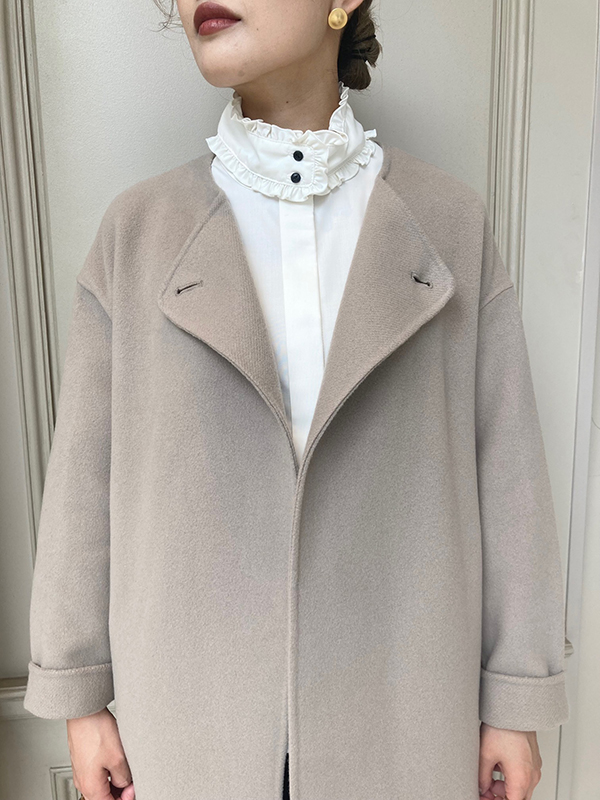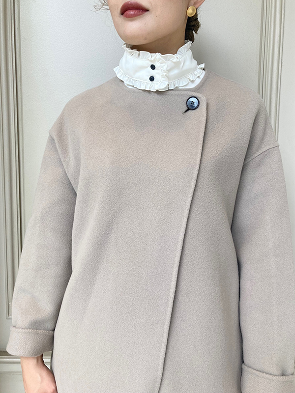 首元のボタンがアクセントとなった、ゆったりとしたリラクシーなシルエットのノーカラーロングコート。