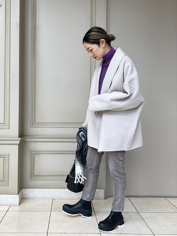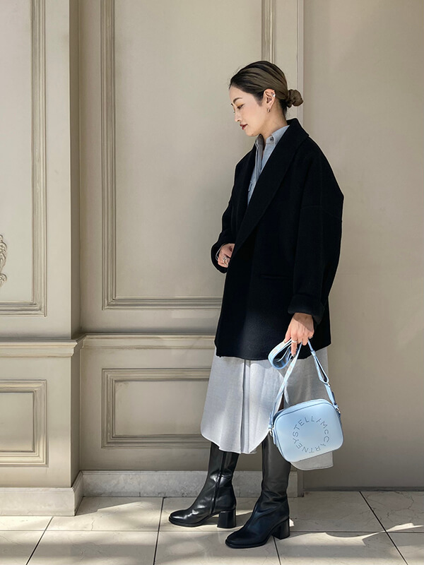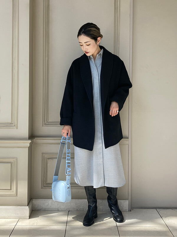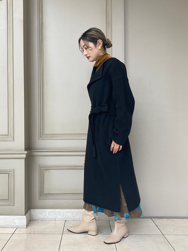 ミドル丈のコートは、旬のロングブーツとのバランスも◎