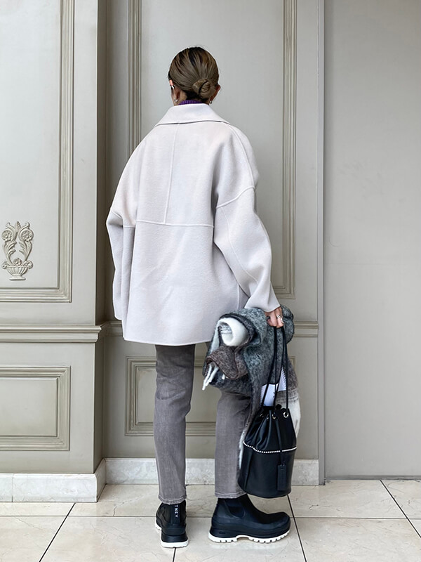 今季はポケットをサイドから前身頃へストレートに付け、デザインポイントに。コクーンシルエットで、さらりと羽織るだけで抜け感のある、こなれた印象に仕上がります。