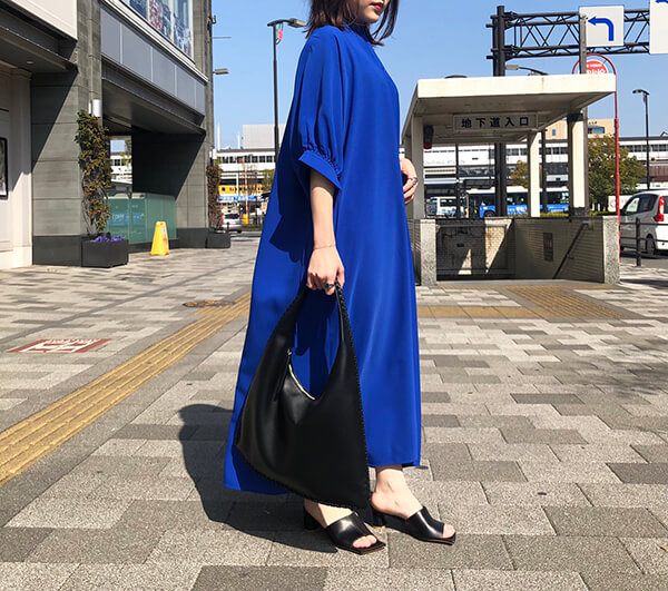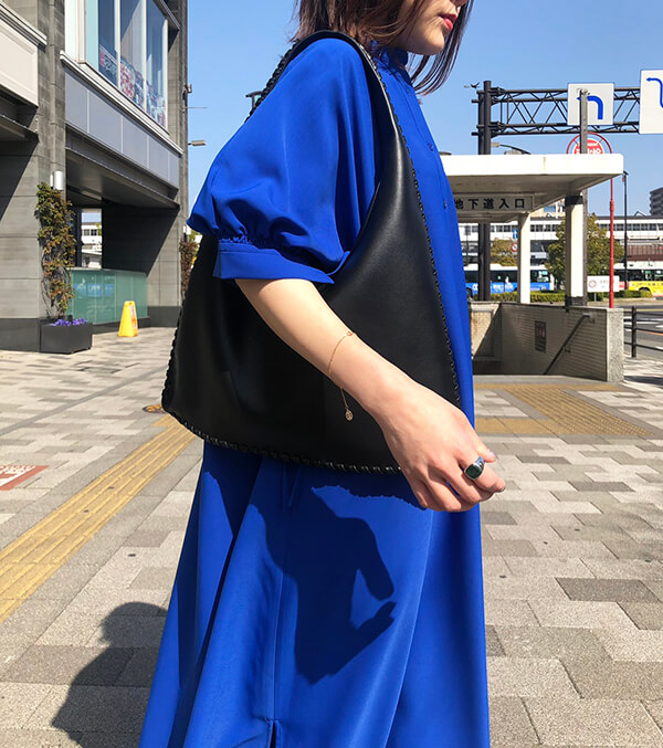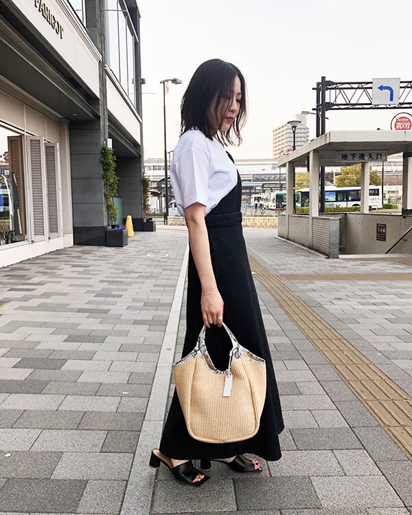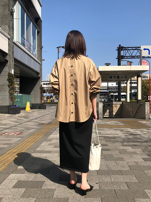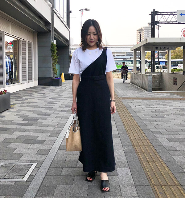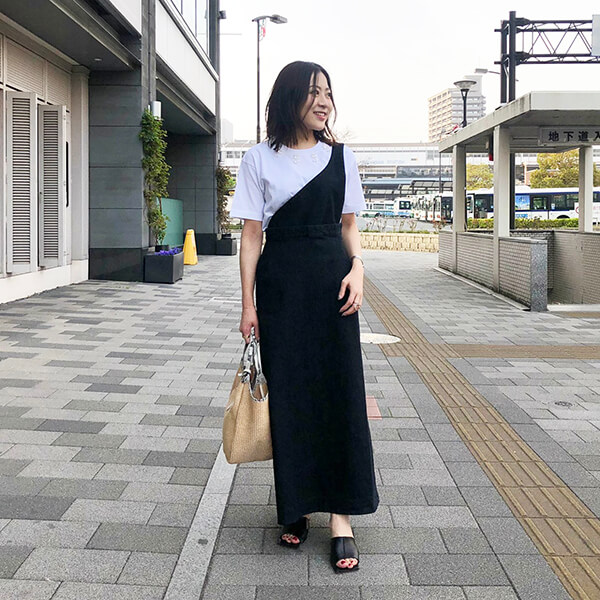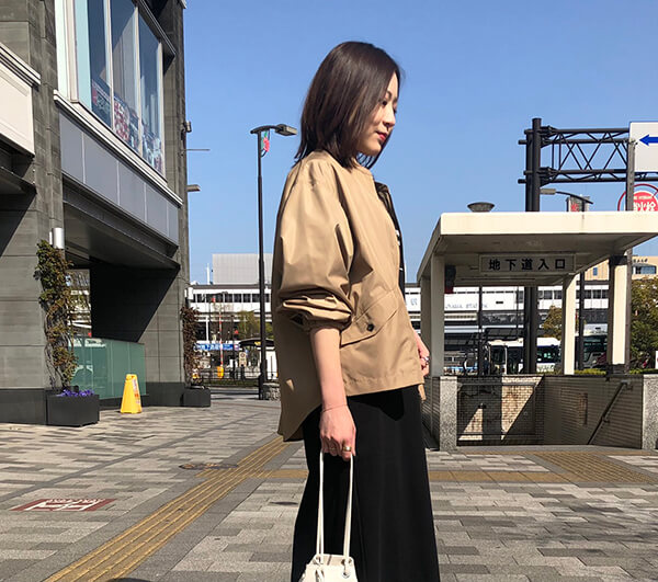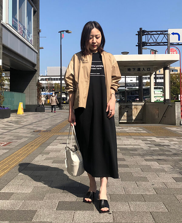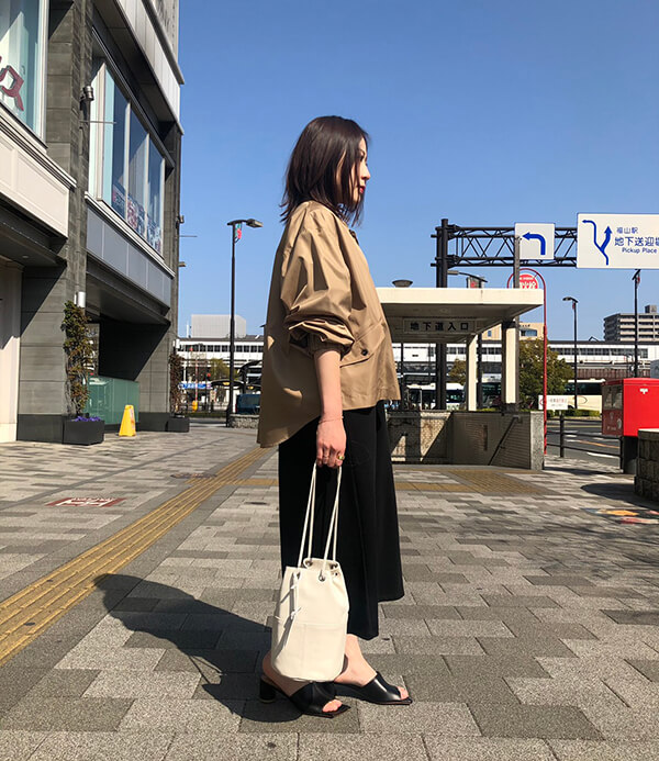 ブラック小物でスタイリングを引き締めて、マニッシュに仕上げました。
