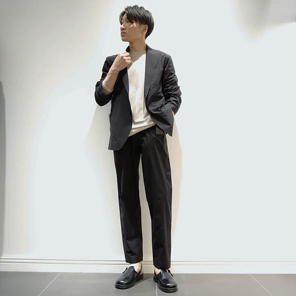 セットアップは今シーズンのトレンドでもありますが、クルーネックのカットソー等をインナーにしていただいて、ラフで抜け感のある着こなしがおすすめです。