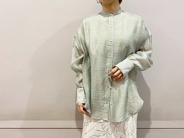 あちこちで見るノーカラーシャツ×シアー素材も、ポイントを押さえれば一気に垢抜けちゃいます!
