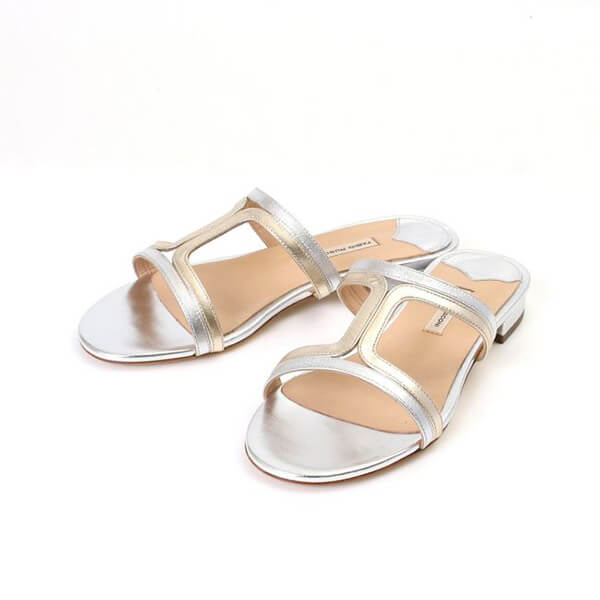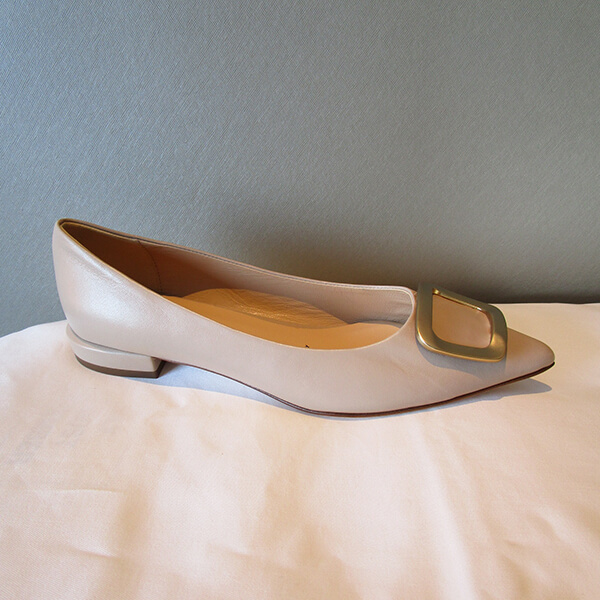 ロングワンピースに合わせて軽やかに抜け感が作れるメタリックフラット。