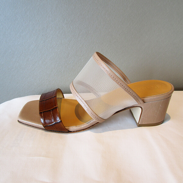 メッシュとレザーのコンビネーションのミュールは異素材ミックスと安定感が人気です。