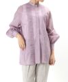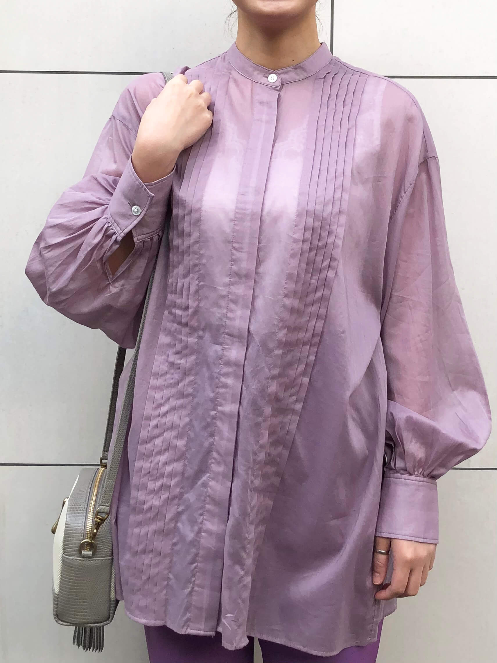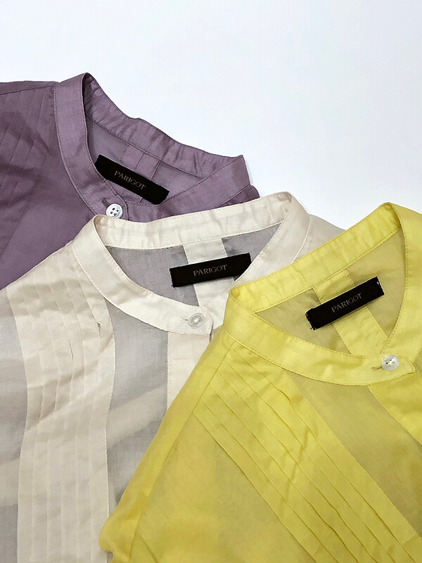またフロントはバンドカラーとピンタックのデザインで、辛口な雰囲気に。