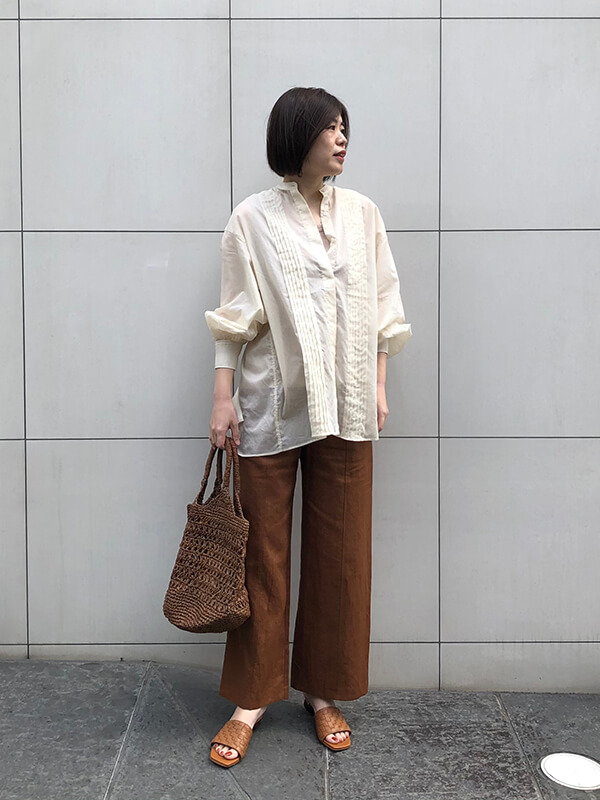 ストレート体型の私は首元のボタンを開けて、少し首回りにゆとりを持たせた着方をしてみました。スッキリ感が増しますよ!