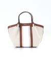 サークルの持ち手とスクエアカットのレザーの切替がモダンなキャンバスバッグ。