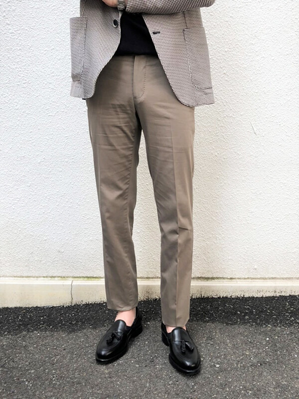 ①シルエットはやや細みのテーパードなので、トレンドに左右されない事。だからジャケットスタイルやベーシックスタイルには欠かせない存在です。