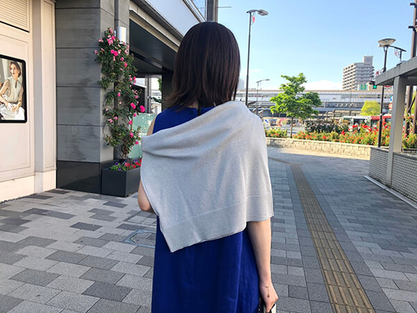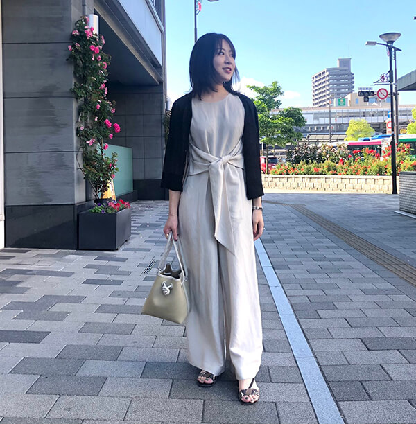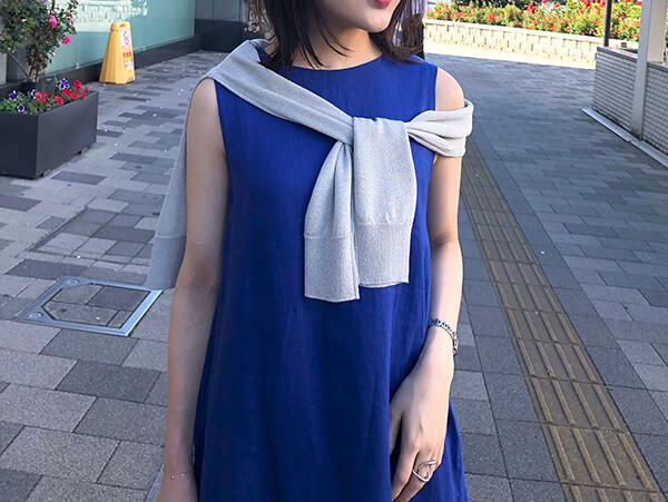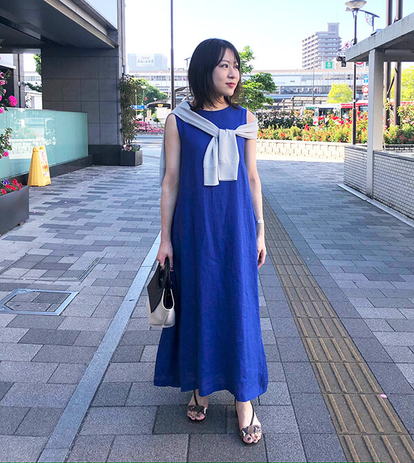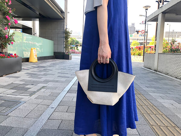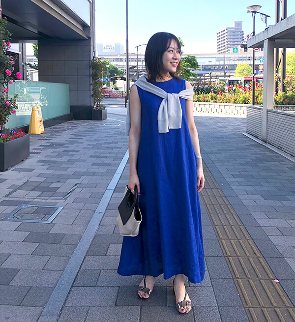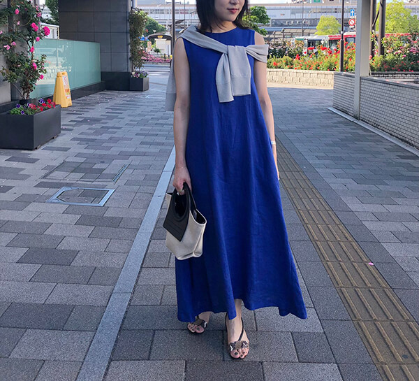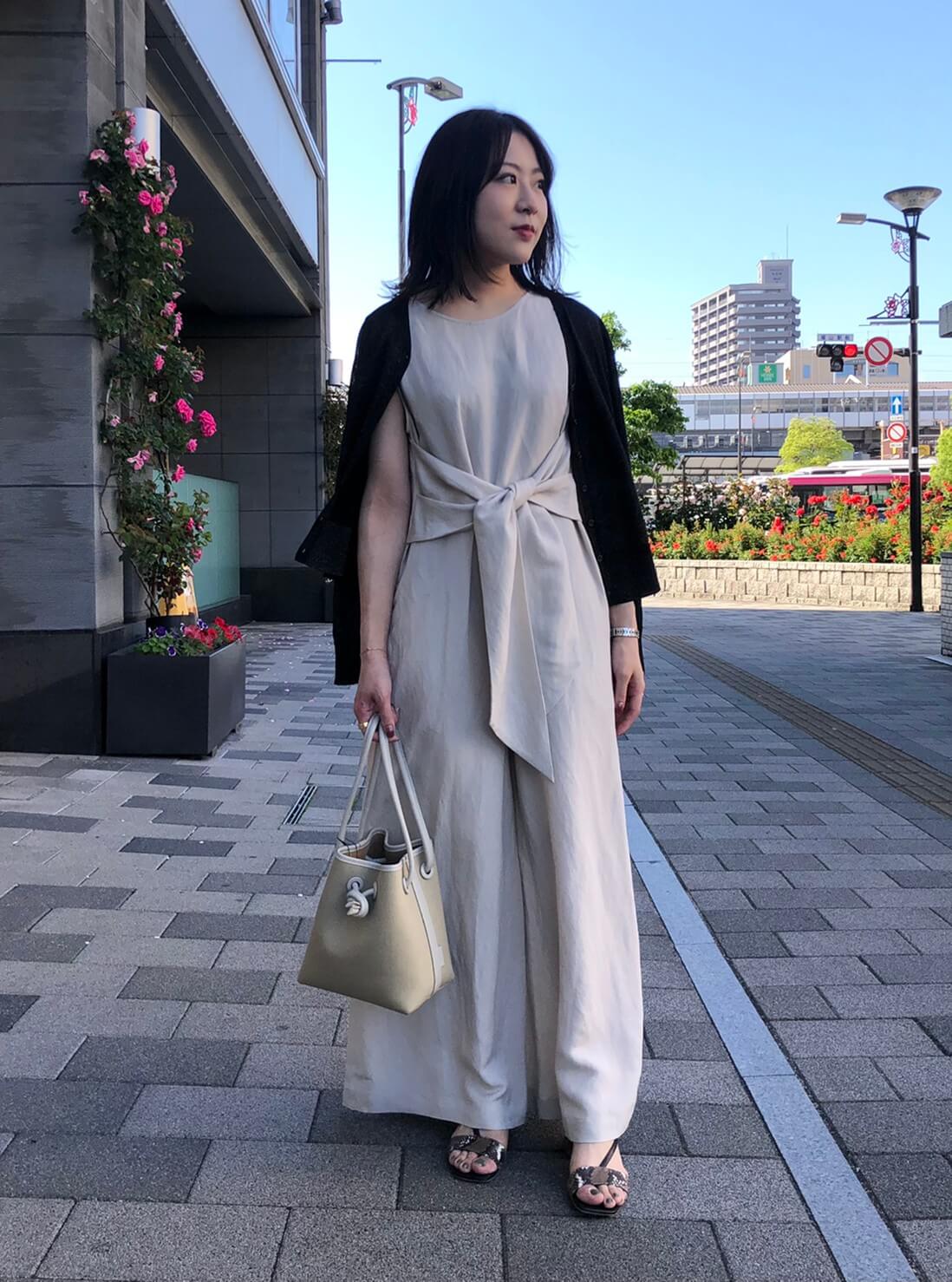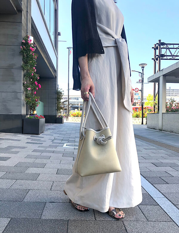 ゆるく肩掛けするだけで、重心が高くなり、ロングワンピースもメリハリのあるスタイリングになります!!