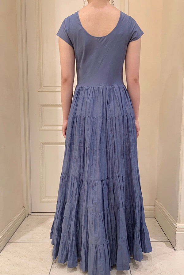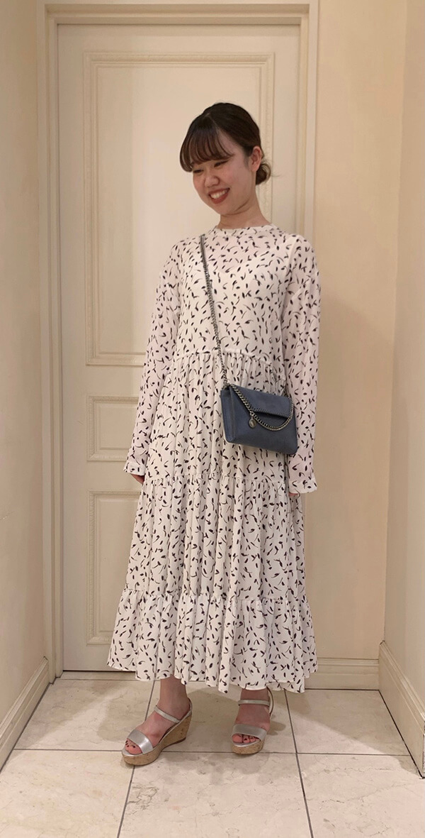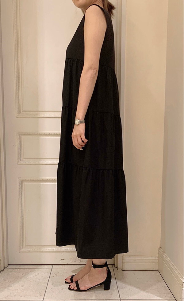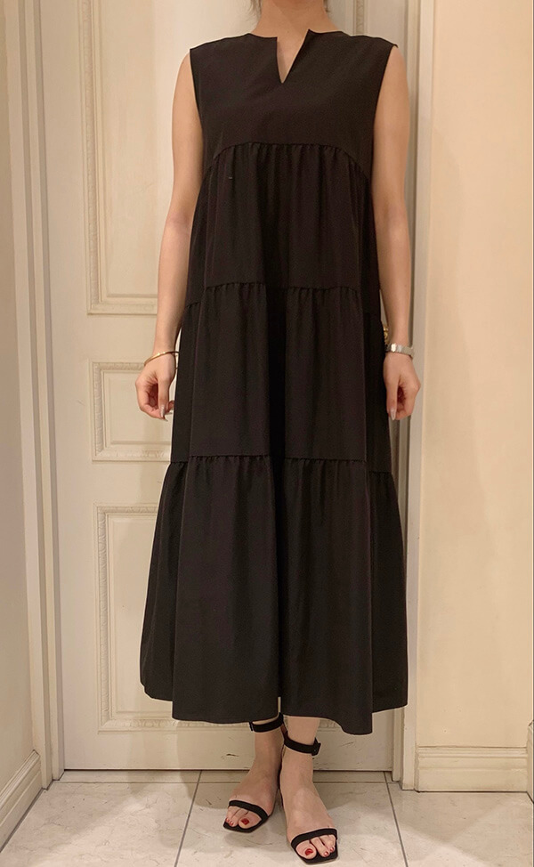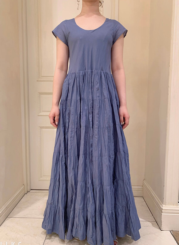 7枚のパネルを組み合わせ、ボリューム感のあるティアードワンピース。