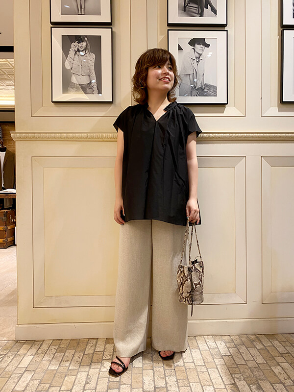 着まわし万能なブラウスをパイソン柄の小物と合わせて、クールな雰囲気のスタイリングに仕上げました!