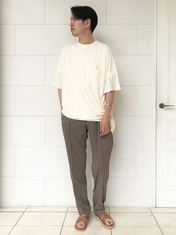 ルーズ×ルーズのシルエットで合わせたリラックススタイル。トップスのアイボリーに合わせて、明るめなナチュラルカラーでまとめたところもポイントです。