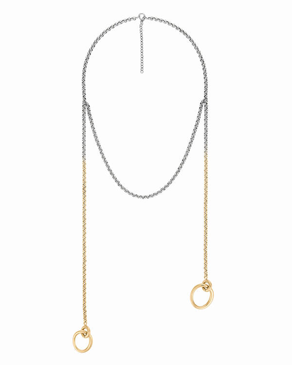 コンビネーションのネックレスはラリエットにしたり、そのまま垂らして付けたりとイメージが変えれて存在感のある逸品。
