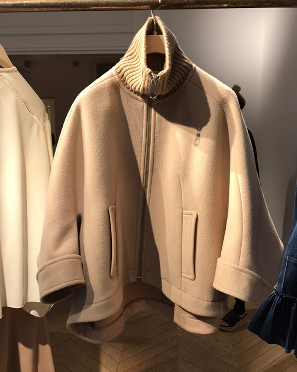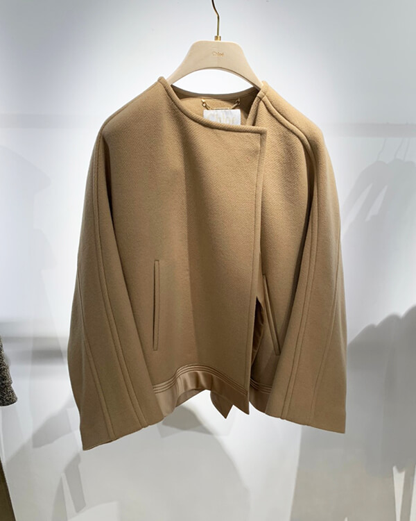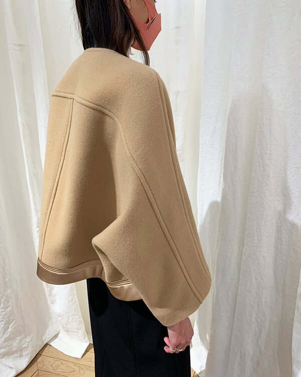 ノーカラーでサテンのトリミングがさりげなくディテールになりシルエットも綺麗な新型ショートも登場。