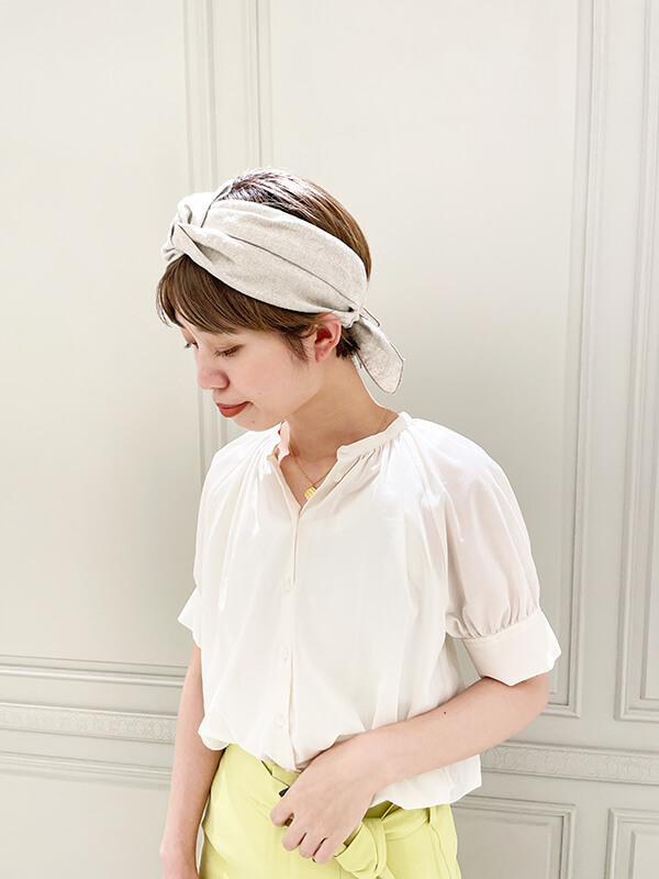 ボタンを開けるとヘルシーな印象に、全て閉めて着ると首回りにギャザーが入りフェミニンな印象に。