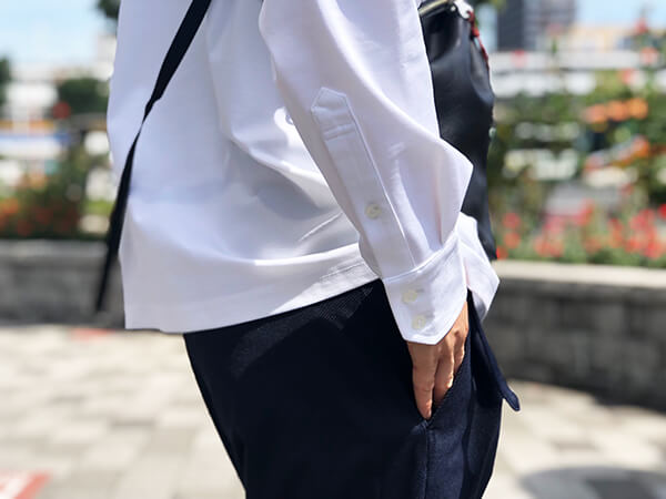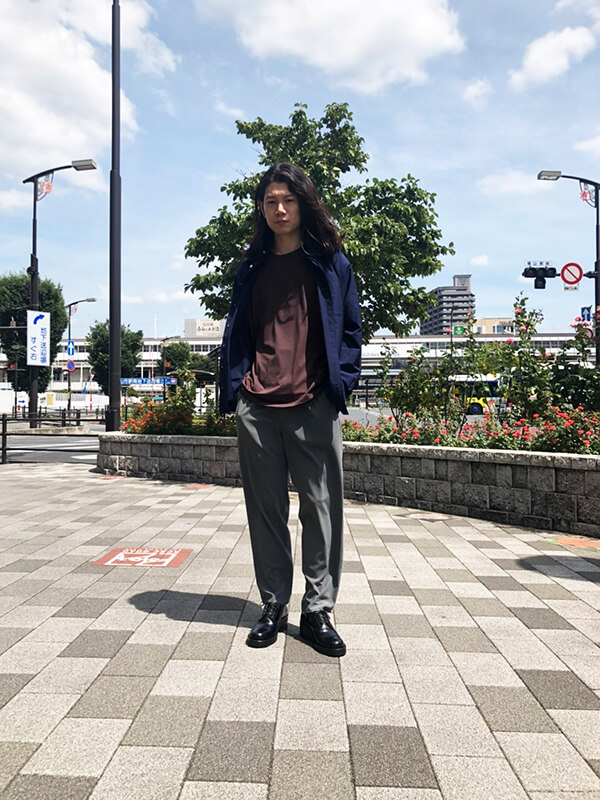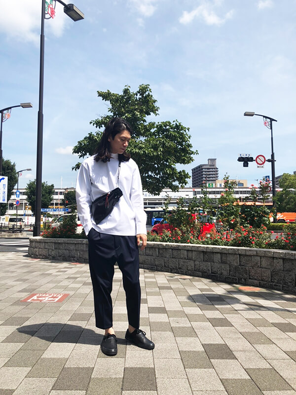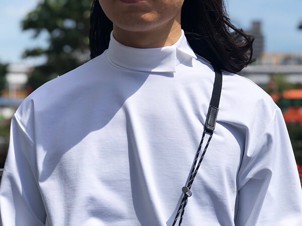 まずトップスは一見シンプルなハイネックカットソーに見えますが、首元をよく見るとシャツのような襟が見えますね。