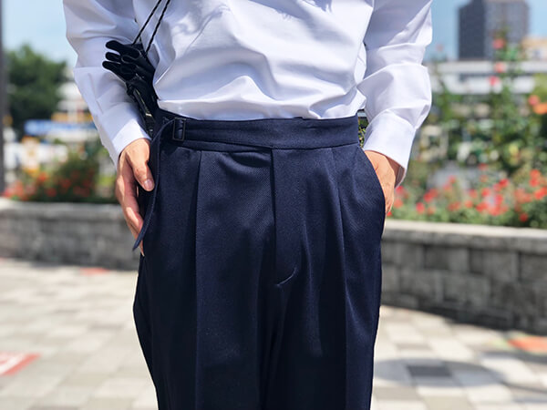 裾にかけてテーパードした収まりの良いシルエットですが、深いアウトタックとダーツを加える事で腰回りはゆったりとした印象です。