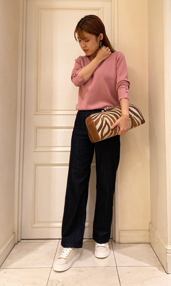 トップスはセットインスリーブのジャストサイズニットにボトムはワンウォッシュカラーのストレートワイドデニムでIラインを引き立たせ、スプリング×ストレートさんの鉄板コーディネートの完成です♡