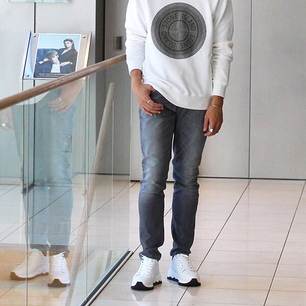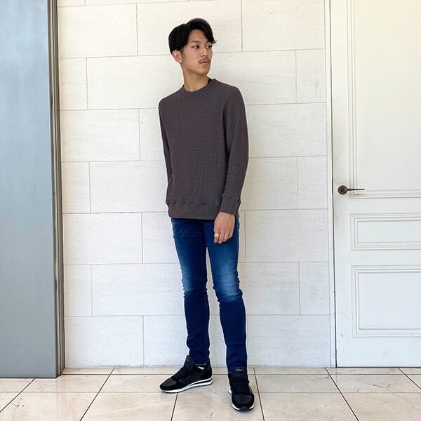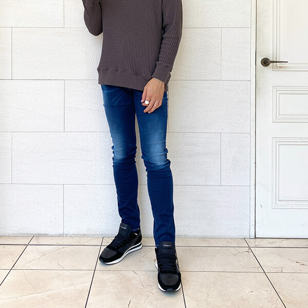 程よいウォッシュ加工が施されており、こなれた印象を醸し出しています。シルエットはスリムテーパードシルエットで足に当たり過ぎない程よい細さのつくりで、スタイルアップにつながります!