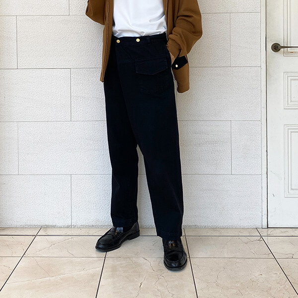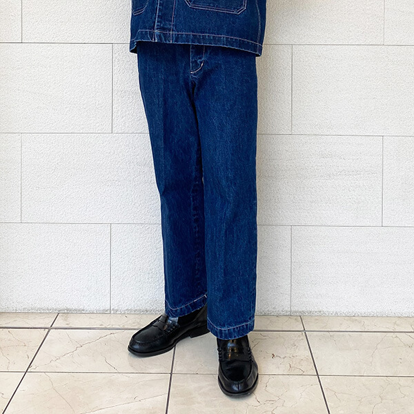 アシンメトリーなタックが印象的なワイドデニムで、MARKAWAREと異なりキレイ目なスラックスに近い印象のデニムです。