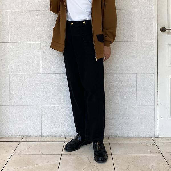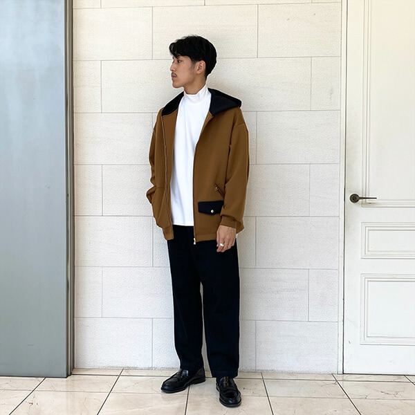 スラックス同様にお使いいただけるのでシャツやジャケットと合わせるのはもちろんですが、パーカーなどとの合わせもオススメです!