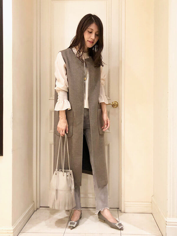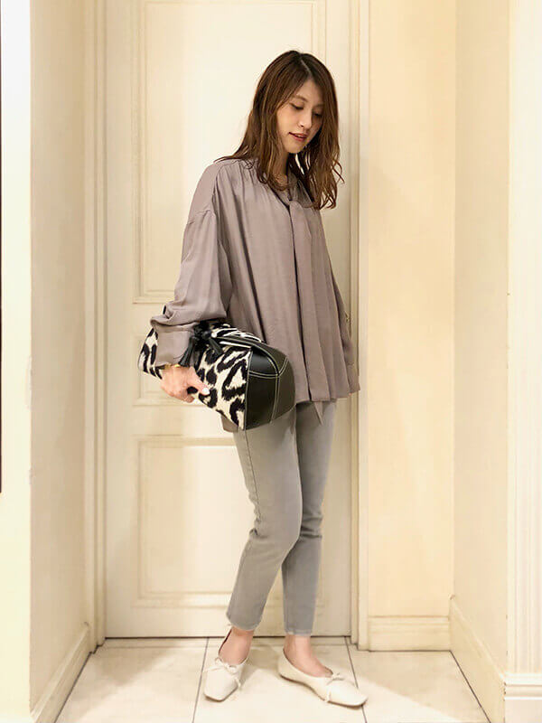上品なカラーはニュアンスカラーコーデで合わせて、女性らしく柔らかな印象に。