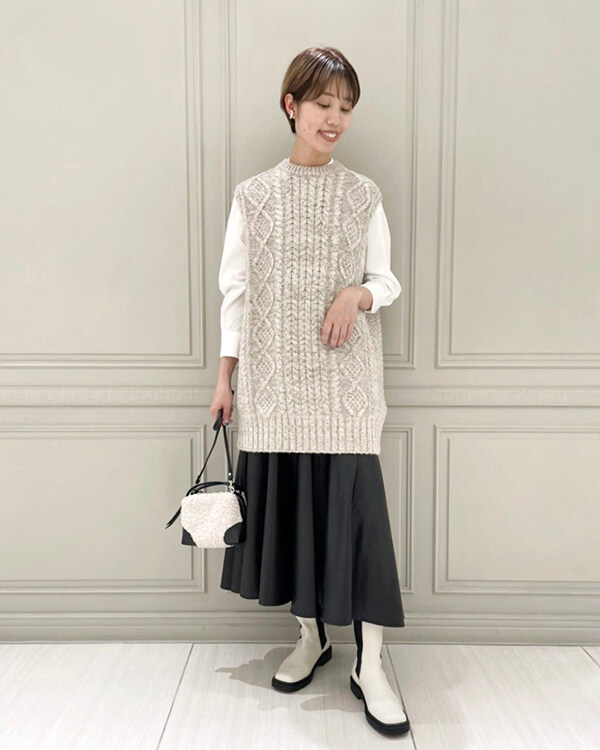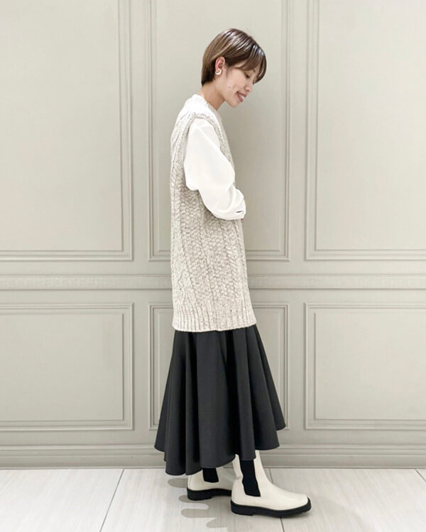 更に色味はオフホワイトで、オータムさんの顔に馴染む色合いなので、ボトムスにパキっとしたブラックを合わせてスタイリッシュな印象をプラス。