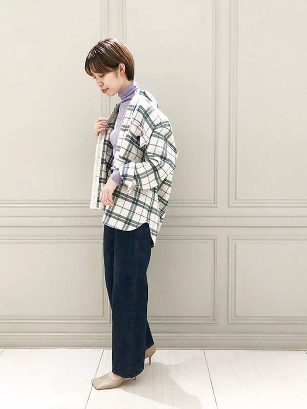 さらにオーバーサイズのシャツコートで直線的でボーイッシュな身体のシルエットに、丸みを出してやわらかさを演出。