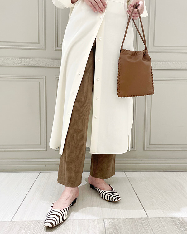 重心を下にもってくるために、パンツををレイヤードし、更にバッグは巾着型をチョイスしました!