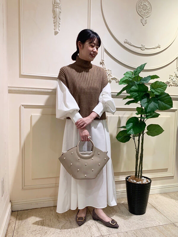 ベージュカラーで統一感のあるコーディネートにパールバッグをプラスしてより女っぽさアップ♡可愛くないとは言わせない間違いなしのコーディネートです^^